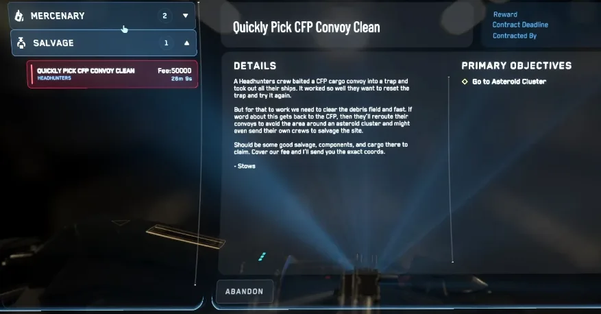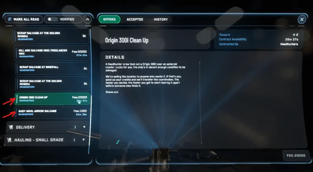 - Start with Arrow Salvage missions from the Contract Manager in your mobiGlas. These are quick, low-combat jobs where you take out small ships and grab loot.
